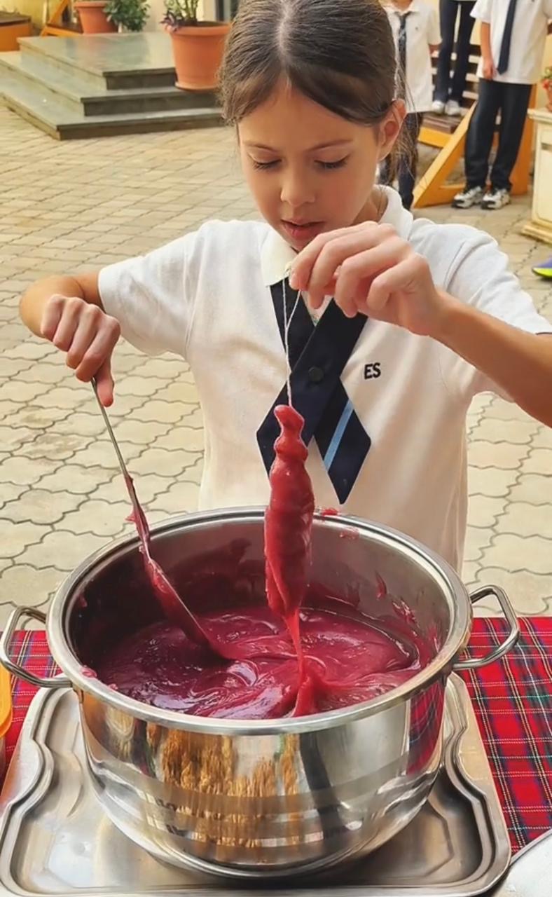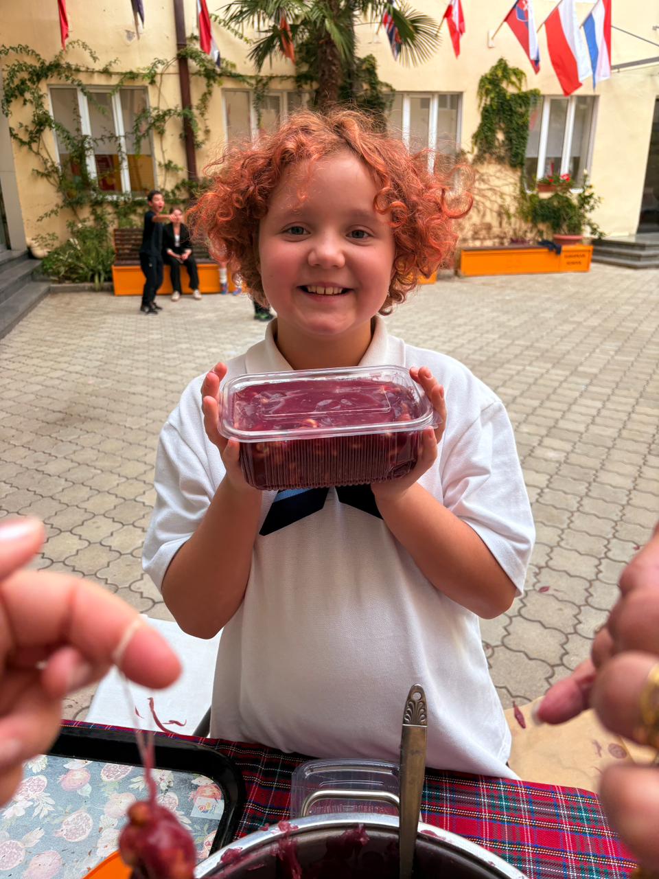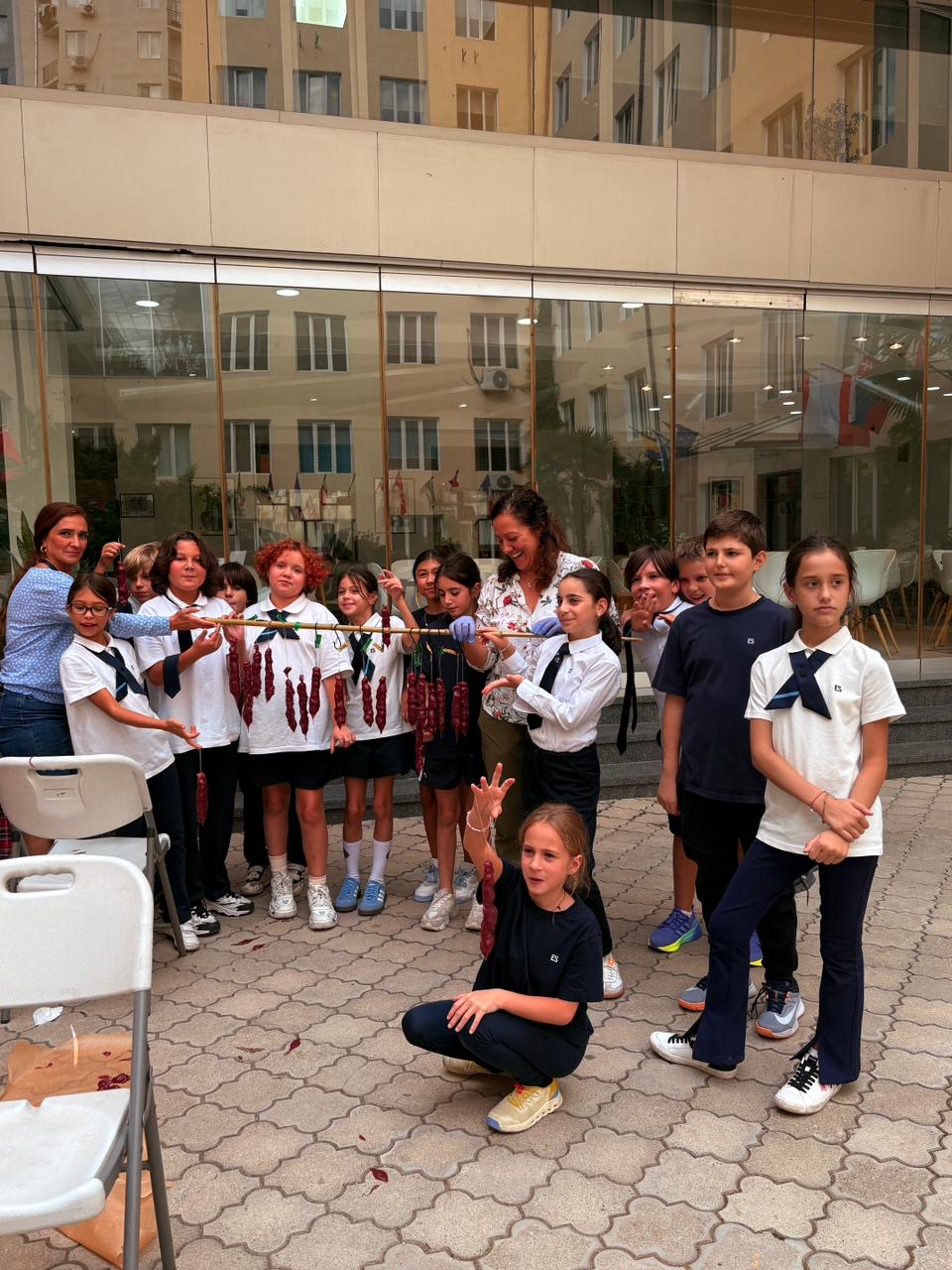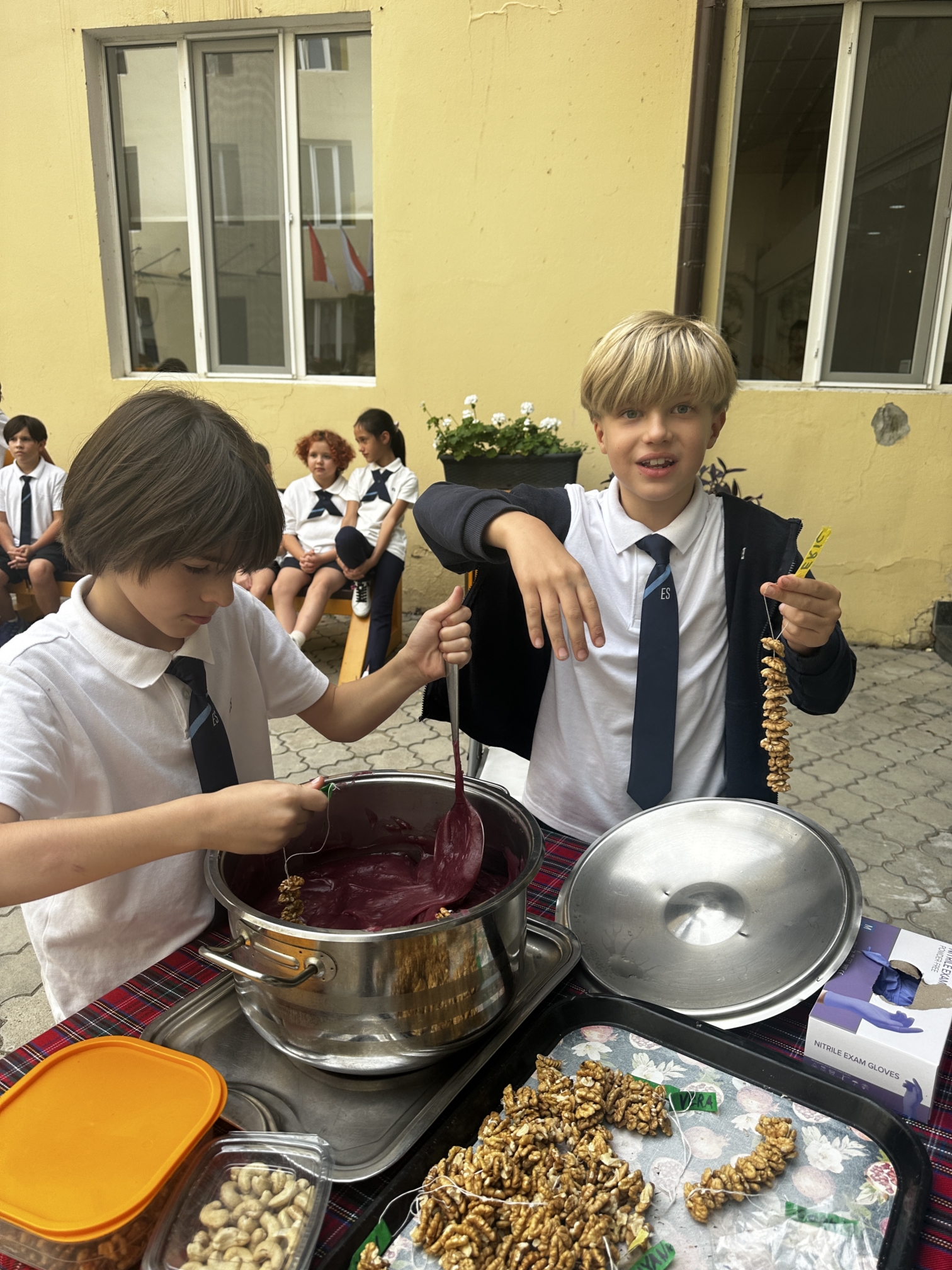 Grade 4A PYP students explored Georgian culture by making traditional churchkhelas, experiencing local customs and culinary traditions firsthand. This activity was made possible with the support of their parents, who provided fresh grape juice and nuts, and the school. Special thanks to the cafeteria staff for assisting in preparing the delicious grape juice/tatara mixture. The students thoroughly enjoyed the experience, delighting in the tasty and healthy treat they helped create.