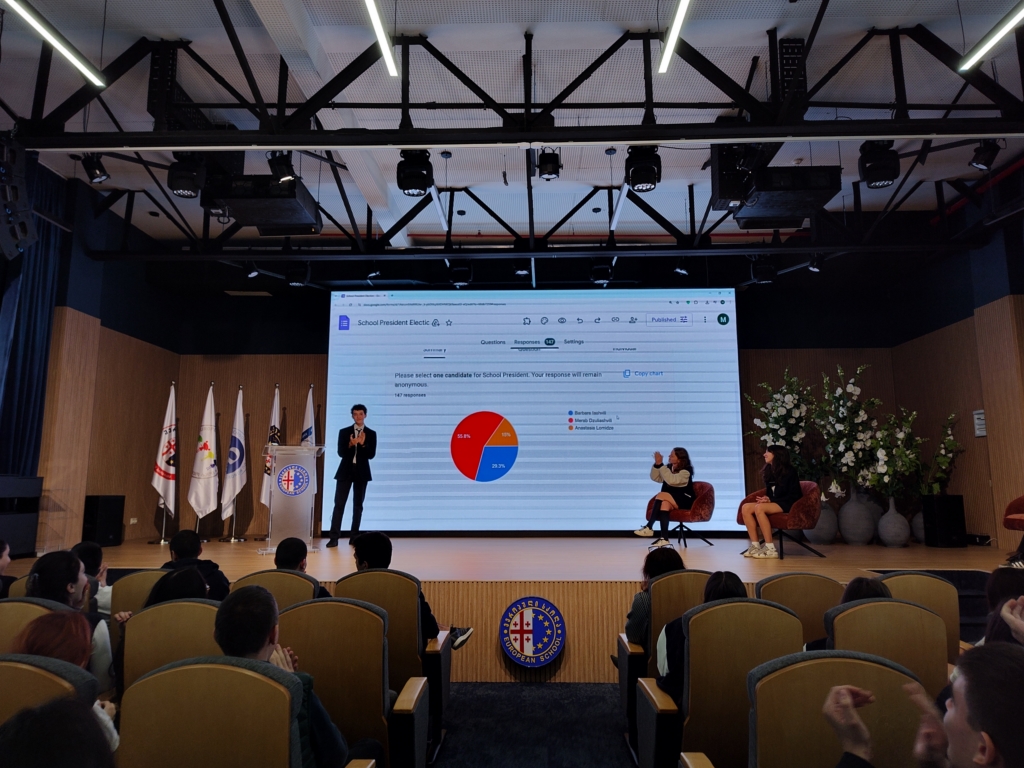 Our outstanding candidates — Anastasia Lomidze (Grade 10), Barbare Ishvili (Grade 11), and Merab Dzuliashvili (Grade 11) — each demonstrated remarkable leadership, vision, and commitment throughout the campaign.