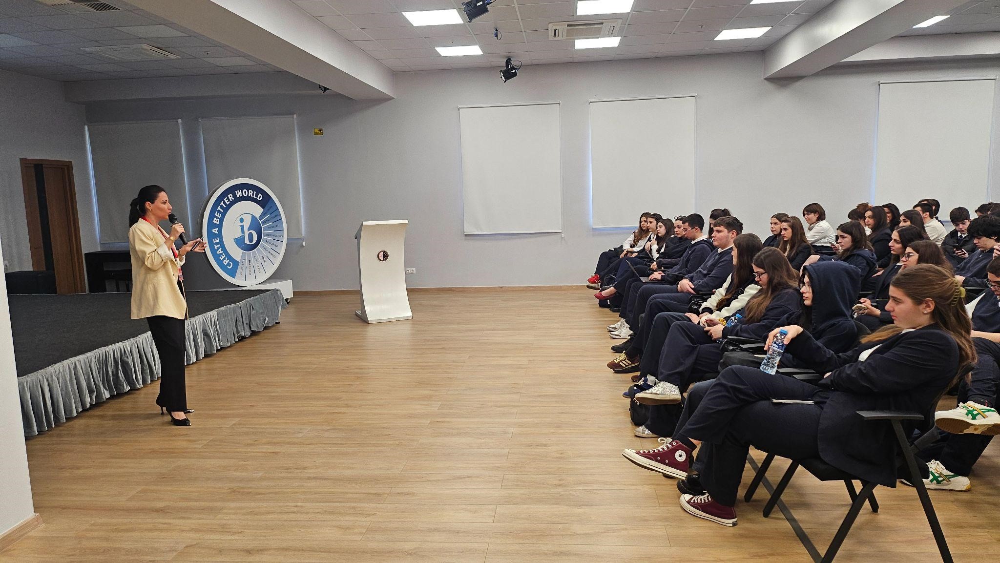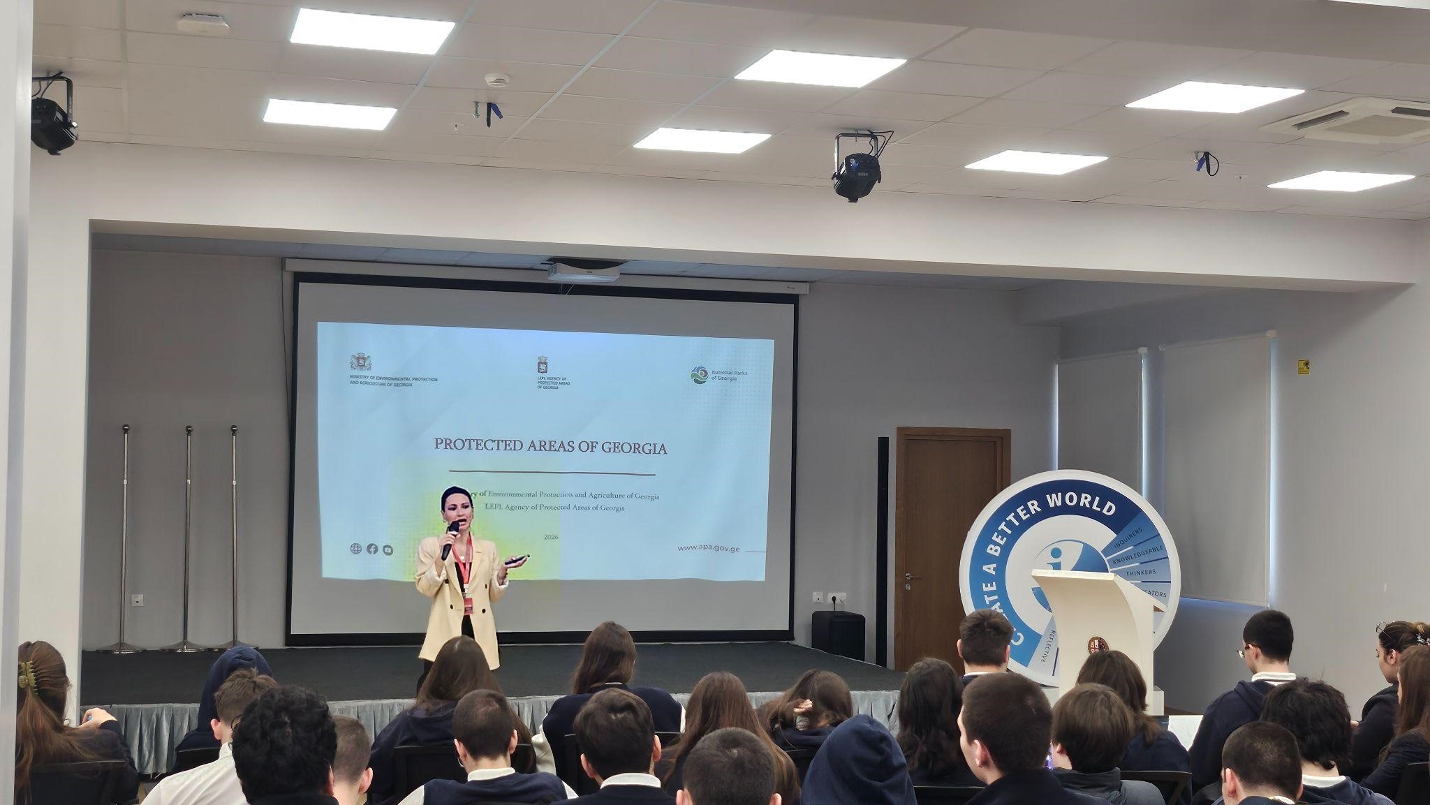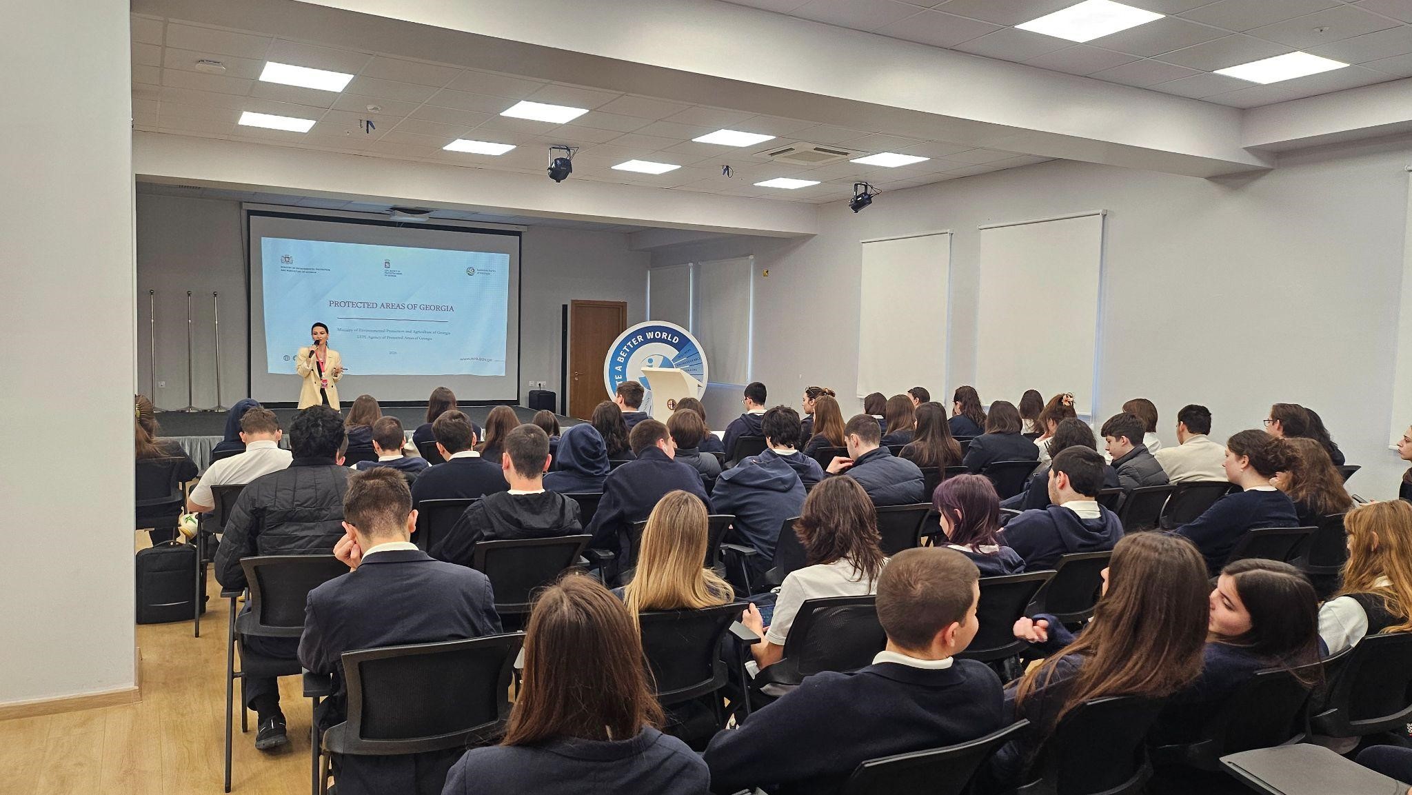 On April 22nd, ES IB 10th and 11th grade students celebrated Earth Day by attending a special assembly. The guest speaker, Ms. Tamar Kakhishvili, Deputy Chairman of the Agency of Protected Areas of Georgia, delivered an engaging presentation about the country’s national parks, tourism, ecosystems, and recreational spaces. Students actively listened, participated in the discussion, and engaged in a Q&A session, making the event both educational and interactive.